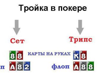 Сет – Тройка, составленная из карманной пары и общей карты, вышедшей на борд. Трипс – Тройка, для составления которой игрок использовал только одну из своих карманных карт, прибавив к ней общую пару того же номинала.