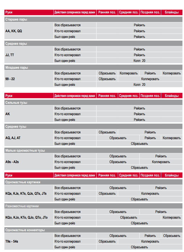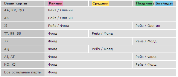 - Стартовые руки следует рассматривать неотрывно от предложенной в тесте позиции. Более того, необходимо учитывать формат, о котором идет речь в вопросе, ведь стратегия для безлимитных и лимитированных столов отличается, как и спектр разыгрываемых рук. Полезной шпаргалкой станет чарт стартовых рук: