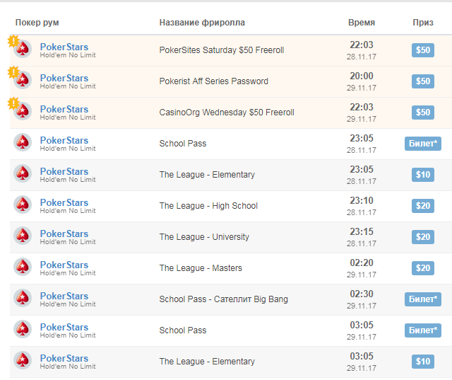PokerStars. Для тех покеристов, которые находятся в поисках покер румов с фрироллами каждый час, лучшим выбором станет лидер мирового онлайн покера. В комнате очень насыщенный график событий без бай-ина для всех категорий игроков: от недавно прошедших регистрацию новичков, до профессионалов, обращающих внимание только на события с солидным вознаграждением.