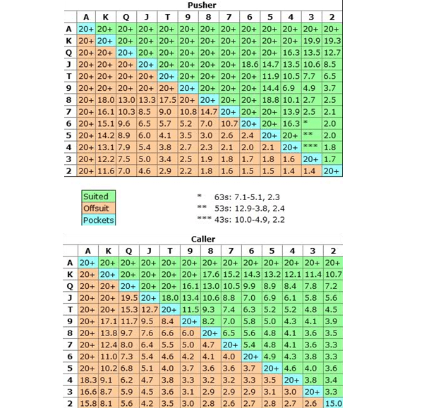 Таблицы Нэша в покере представляют собой хорошо известные и простые в использовании чарты стартовых рук. Они подходят для стратегии Пуш-Фолд и рассматривают игрока как с позиции идущего в олл-ин, так и с позиции участника, принимающего решение для ответа на агрессивные действия оппонента.