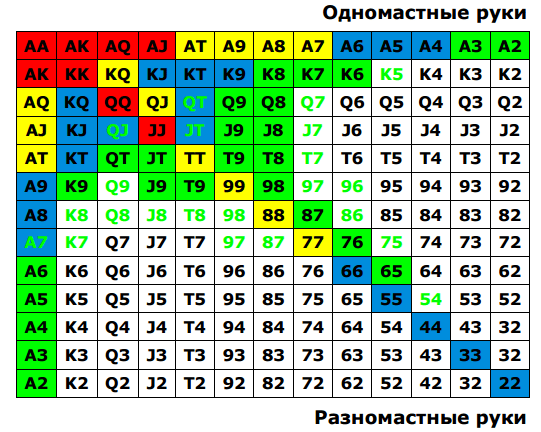Используя данные таблицы стартовых рук в Холдеме, следует учитывать, что спектр рук для более ранних позиций также учитывается и в последующих.